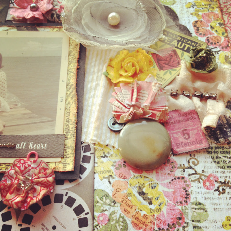 Supplies used: Basic Grey 'Out of Print'- storyteller and , Echo Park 'Note to Self' 6x6 papers, Black cardstock by Bazzil, Colorbox pigment inks in blush, lipstick, and black. Smooch Spritz in 'Pralines and Cream', Tim Holtz distress stickles- 'dried marigold' and 'scattered straw' also Glitz stickles in 'platinum'. Webster's pages Florettes-grey tulle flower, Queen &Co twine-brown/white and yellow/white. Carte Bella 'life is beautiful' word sentiments. Crate paper cardstock cutouts-American Beauty and stamp, Sticky Thumb pop dots, paper flowers/roses- Prima and Recollections, pearls-Michael's, vintage buttons, rhinestone ruffle- Prima, Tim Holtz salvage stickers 'crowded attic'. Pier 1 paperclip flower, vintage buttons, cardboard piece and fabric from my stash.